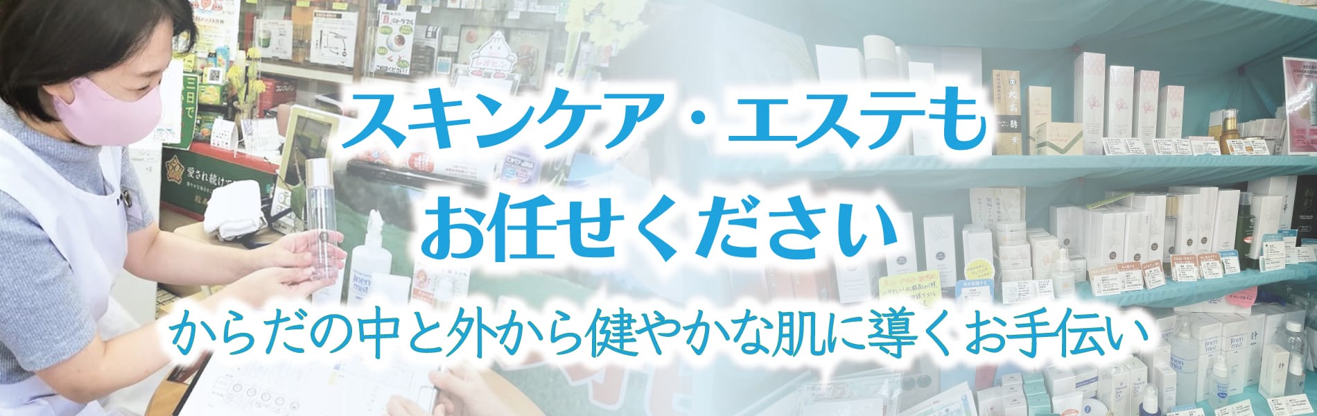 お客様のお肌の状態や生活習慣をお聞きし、からだの中と外から健やかなお肌に導くお手伝いをいたします。またエステルームでリラックスしながらお手入れもできます。
