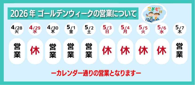 2026年のゴールデンウィークの営業につきまして、以下の通りご案内申し上げます。